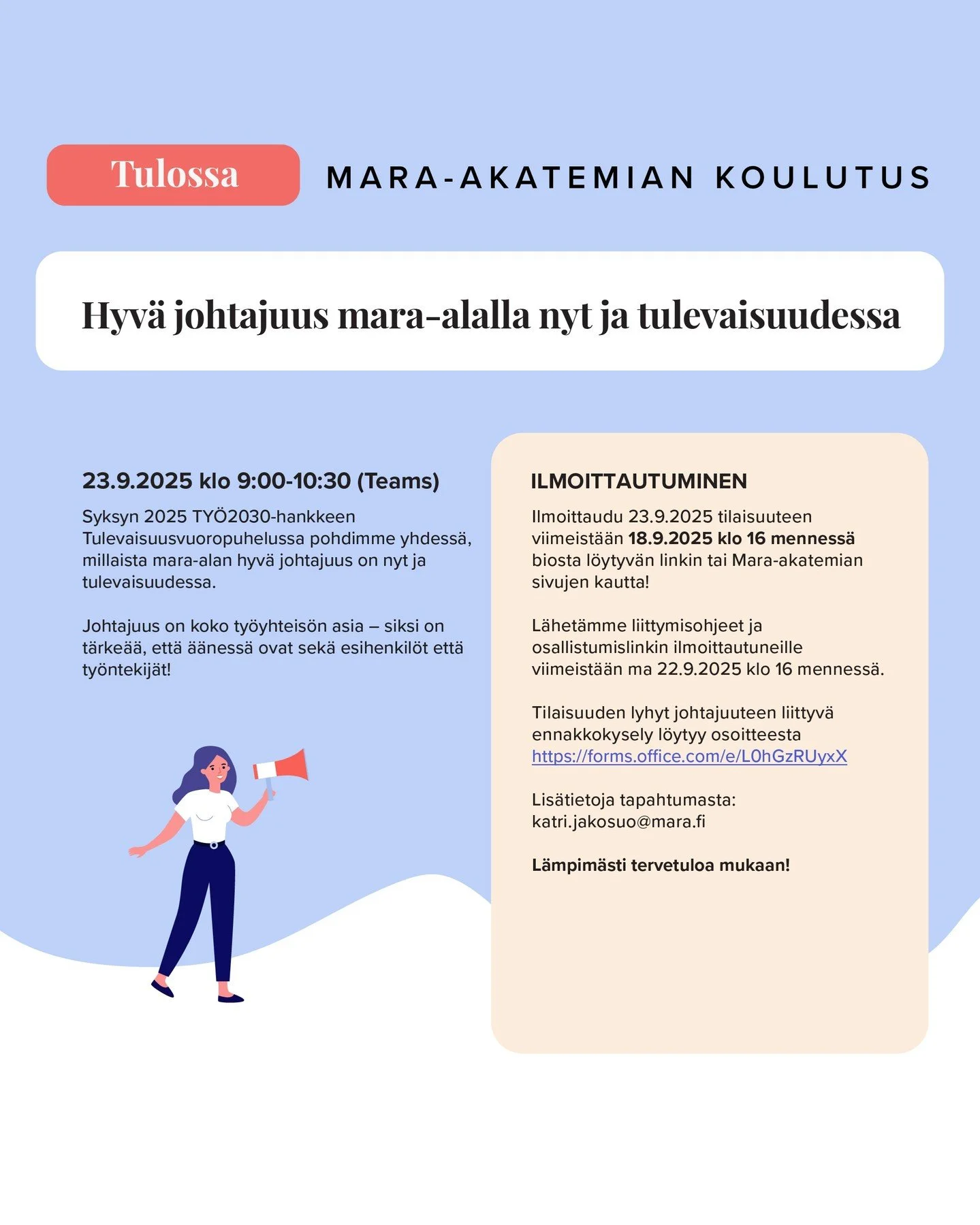 Voit liittyä verkoston jakelulistalle lähettämällä sähköpostin osoitteeseen mara-akatemia@mara.fi.